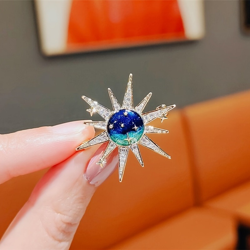 This delicate brooch features sparkling cubic zirconia crystals arranged in a stunning sun and stars design, evoking the beauty of the universe. Perfect for adding a celestial touch to any outfit, it can be worn as a lapel pin, shawl clip, or even a corsage. Ideal for accessorizing hats, bags, suits, or ties, this versatile piece makes a thoughtful gift for weddings, birthdays, and other special occasions. An enchanting addition to any jewelry collection!